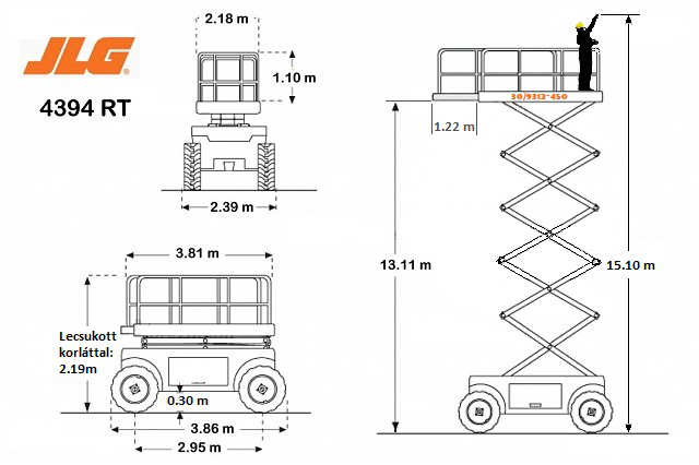 JLG 4394RT egy önjáró kültéri ollós emelő, amit első sorban nagyobb épületek, csarnokok építéséhez, gépészeti kivitelezéseihez, karbantartási munkáihoz használnak, ahol jellemzően nagyobb teherrel kell elérni a nagyobb magasságokat. Robosztus, erős, stabil szerkezet. Bármely munkamagasságában vezethető, anélkül, hogy le kellene engedni a munka platformot. Benzin/Gáz üzemű motor, négy kerék meghajtás (kettő kormányozható), hidraulikus differenciálzár a rosszabb terepviszonyokhoz, hidraulikus szintező stabilizátorok, levehető vezérlődoboz, üzemóra számláló, hidraulikus fékek, kiváló manőverezési képességekkel.